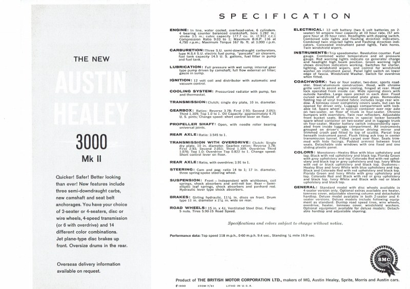 A reproduction brochure, created in 1982 by Austin Healey Association in the USA about the 1961-62 Tri-Carb 3000's. from the original released at the time.