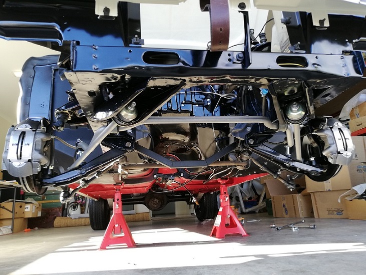 I have been fitting the original type Kelsey Hayes 4 pot calipers and rotors, Right side, I needed to rework the rotor back plates to fit the HD spindles. These are the same brakes that were used on the later Mustang GT350s but the Falcon Rallye Sprints also had an in line Hydrovac booster mounted where the battery was.