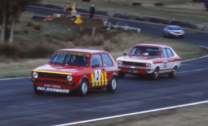 Graham McGregor in the Continental Car Services Golf GTI #2 was in the Sports Sedans & Clubmans Saloons on March 27th 1983 and Geoff Welson in the Avenger GLS #57 was in the Production Super Car Series on the same day but they don't appear in the same race in the programme. From the Motoring News report of that meeting it seems there was some mixing of the two classes but I can not confirm that.