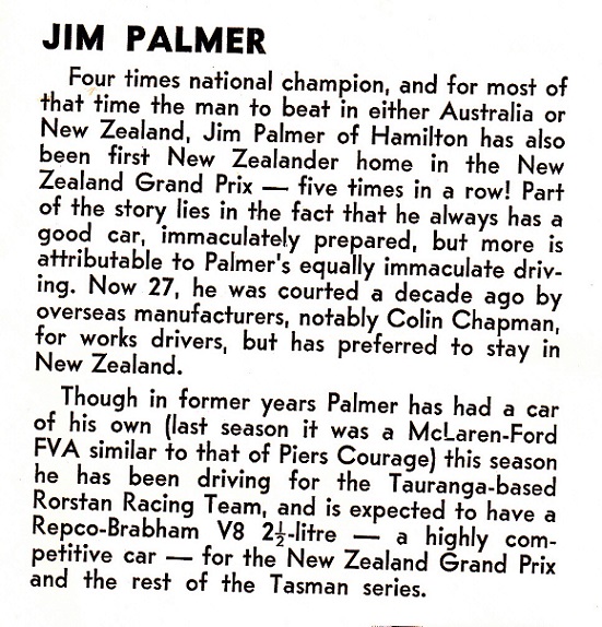 Hey, I did find this find this bit on Jim Palmer in the 1969 programme. Interesting comment regarding Colin Chapman. Also ironic in the picture of Bolton through the hanger (post # 286) that it is Jim Palmer driving by in his McLaren M4A.