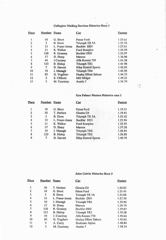 Here is the entry and results for the 1994 event Races 1 and 2 - Sports Cars - for the Marcos and Car #11 .. a " Ford Scorpion ". Now we know ! wonder where that car is now ?? .