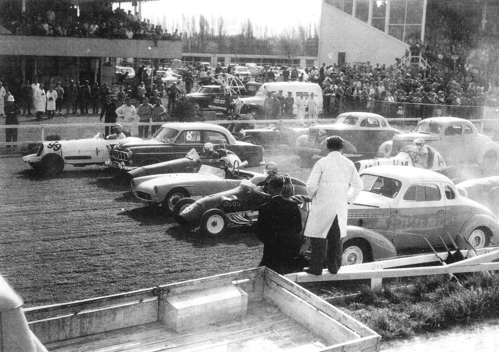 A photo of one of the Grids for a Race - with a Buckler in the front row - believed to be Merv Mayo - car is two tone.