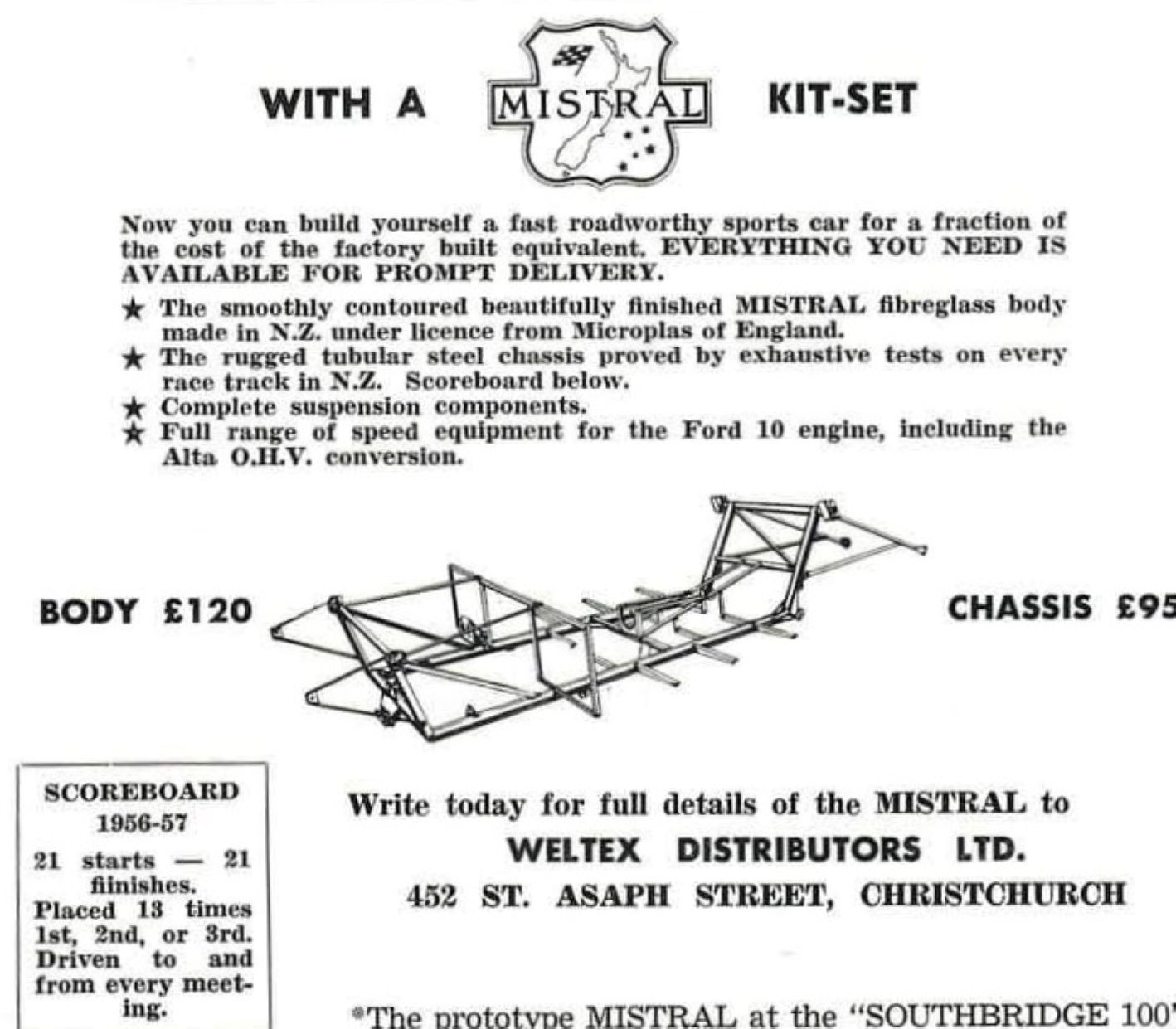 On further reading the Mistral Chassis, was a New Zealand creation as Microplas the creator of the Mistral bodies did not build or design chassis, the body was designed for going on to Ford 10, Triumph TR2, and custom chassis.