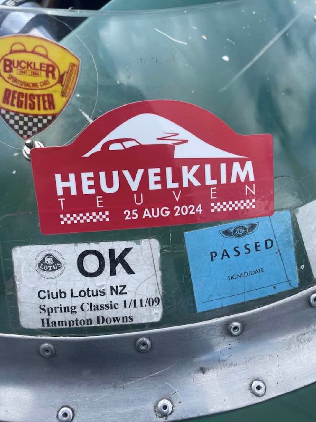 The Hill Climb sticker on the car. August 2024 and a sticker from 2009 Club Lotus at Hampton Downs as well.