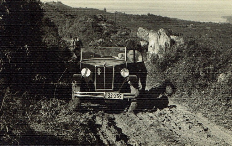 In the Morris 8 Tourer - Mackies Rest in the Waitakere Ranges, near Piha - also in 1946. Una pushing.