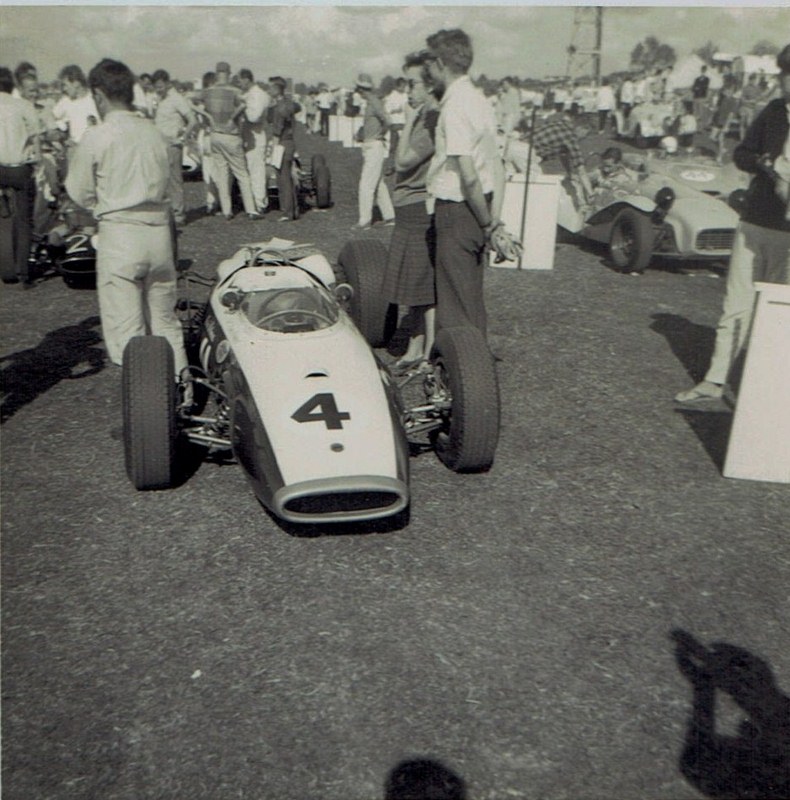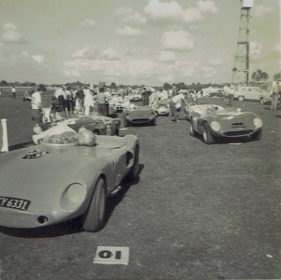 The Sports cars get ready - Car on left trhe Orchid Special with a De Joux body Bucklers with similar bodies , Daimler SP250 Honda S600 [ another photo later of this car ]
