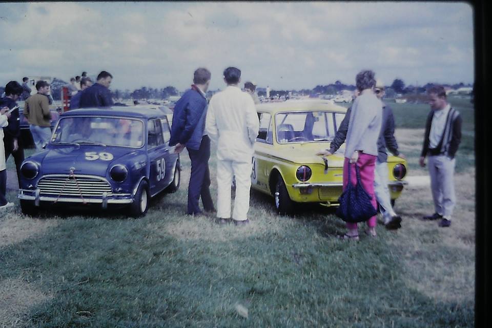 Alan Boyle added - " Ron Brown sits in his Blue 997 Mini next to the yellow Imp of Roy Harrington who is standing behind my G/friend Margaret. Ken Sleath at far right, Ken died some years ago. . In the Centre in Blue jacket Peter Hutt, Ron’s mechanic ex Dominion Motors, where Ron also worked, Pukekohe late 1966 to 68 ? "