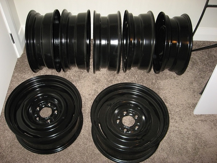 I dropped the Kelsey Hays 15 inch steel rims (which was what was actually used on the Monte Carlo Falcons) and 3 spare 15 inch rims into the sand blaster and had them blasted, zinc coated and painted black.