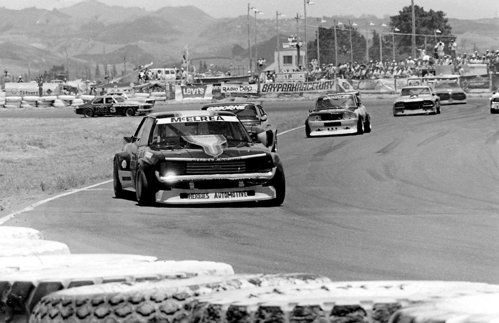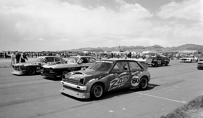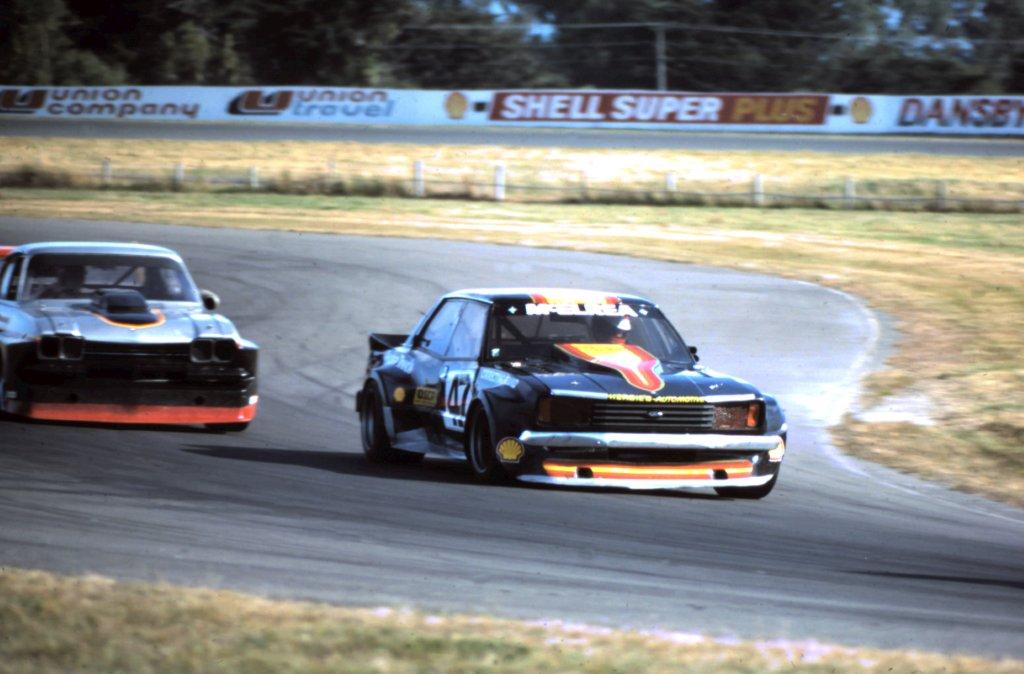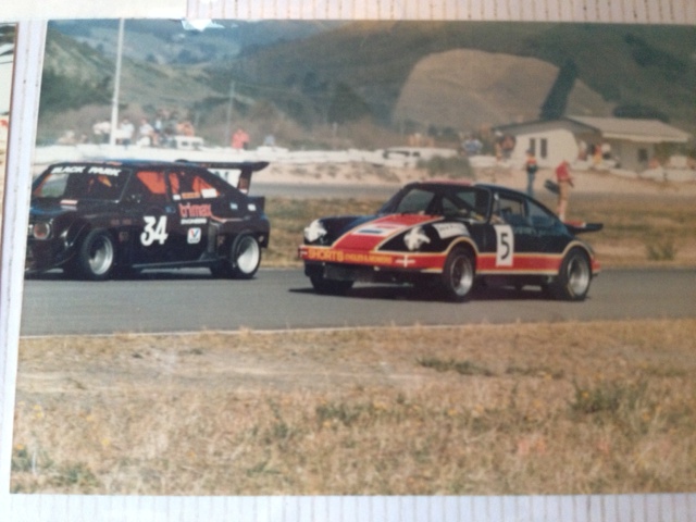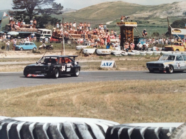 Pukekohe Grand Prix 1986 Ian Algie and myself (Jim your car come off in the grass just behind us)