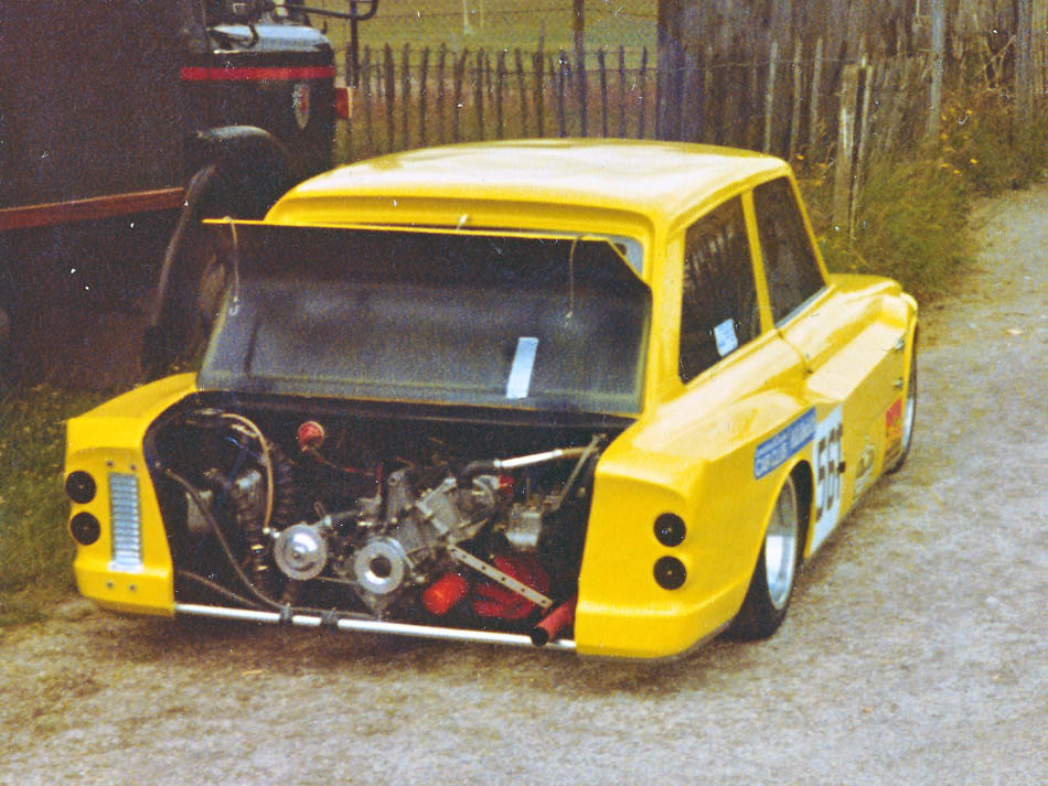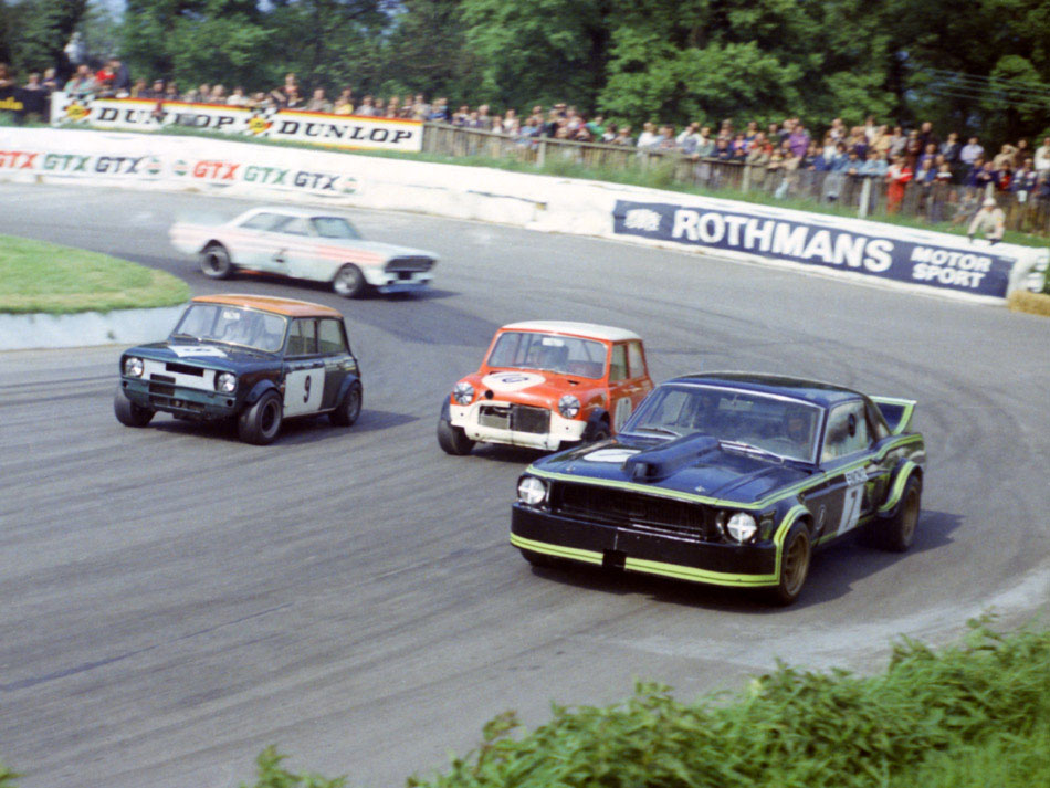 The 7 litre Mustang driven (not owned) by Tony Rosen laps the Minis on this 1.35 mile track. Sadly, the Mike Berman 'Berpop' was a non-starter. Fastest was Alec Poole or Rhoddy Harvey-Bailey in the Broadspeed modified Escort. My pic of that is too fuzzy to print. Sorry.
