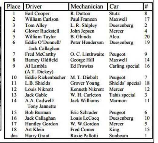 The three Peugeot entered in the race all had engine failures due to broken connecting rods which may have been due to oil supply issues during the long climbs on the course compared to racing at Indianapolis and Savannah etc. on flat tracks.