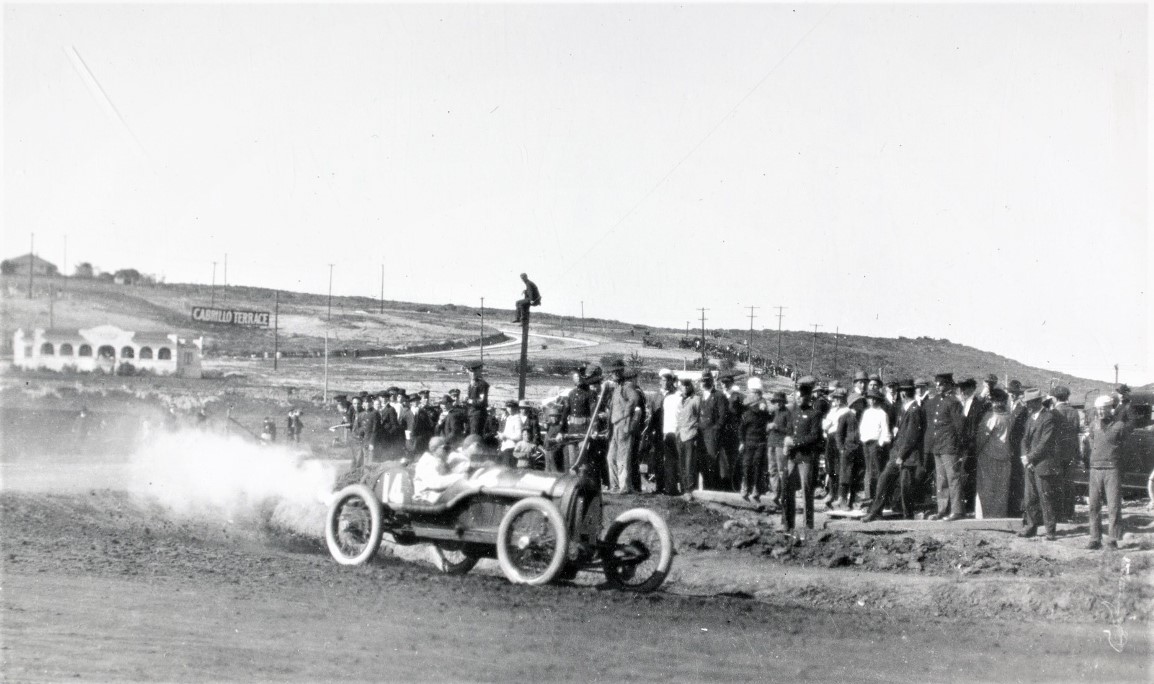 In 1915 spectator safety was not a top priority as seen in this image showing # 19 Duesenberg powering through the turn going up Chatsworth Blvd.