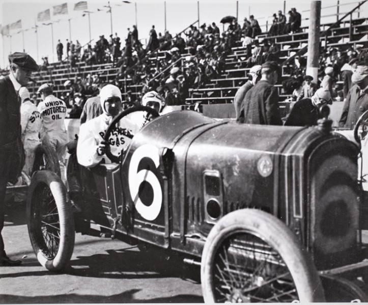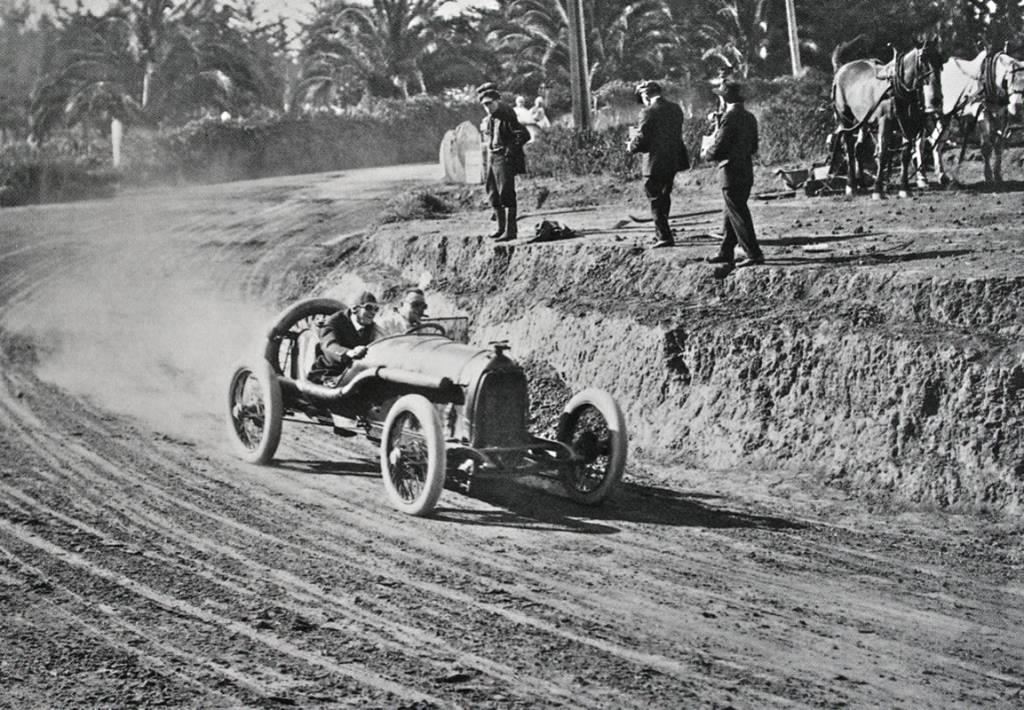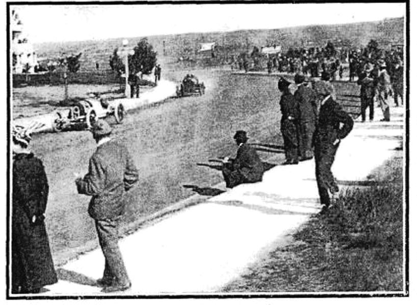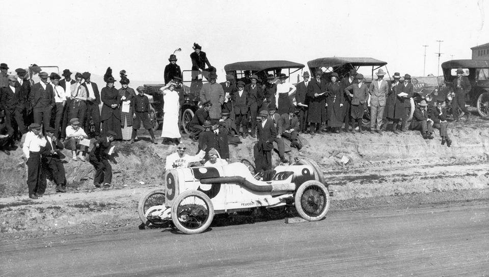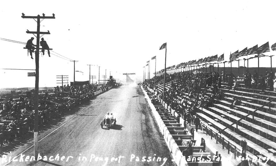 1915. Eddie Rickenbacher, who later went on to be a famous pilot and air ace, driving his Peugeot down the straight completing another lap. (Note the position of the pole and the spectators !)
