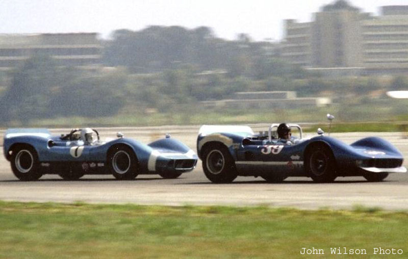 Couple of really great John Wilson photos here, which show the McLaren at the 1967 Santa Barbara Road Races, which it won. The first shot has Jim Adams leading Roaring Season member Jerry Entin, also driving a McLaren MkII/M1B.
