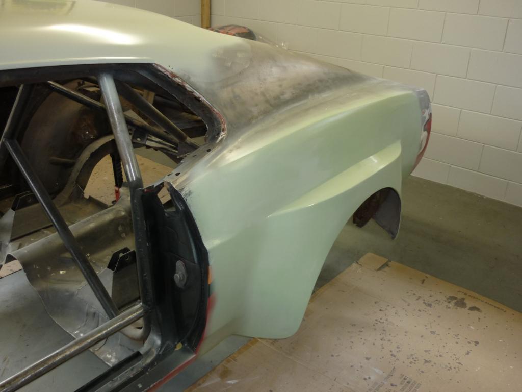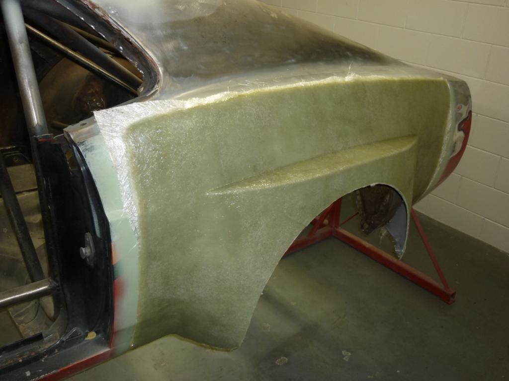Here are some shots of the right rear guard after I reworked it back to the shape it was when first built, then I painted it then put on three coats of releasing wax and then 1 coat of release pvc and then the fiberglass mat to make the mold for the replacement flares that would be fitted once I had replaced the rear fender with a new one. It sounds quick but there was a lot of work to achieve it