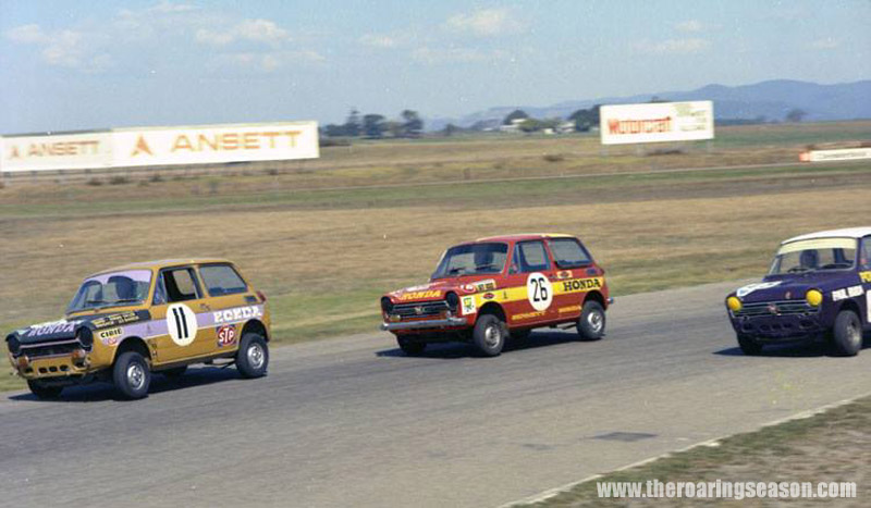 This is Leo Geoghegan, smoking it (literally!) through Lakeside's Eastern Loop in his E38 Charger. John Humphrey chases in the Cooper S.