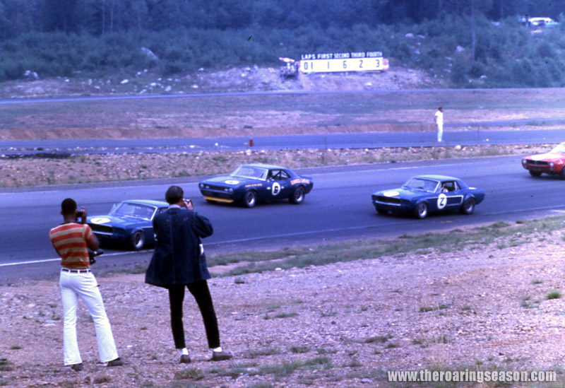 Mark Donohue gives chase to one of the Shelby Mustangs. Note the spectator cars in the background, and what appears to be nothing separating them from the track.