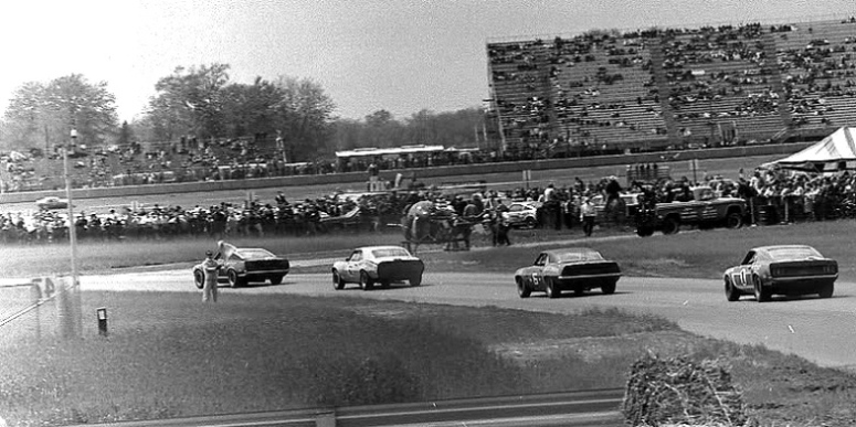 "The group of cars in the picture is led by George Follmer's Ford Mustang, followed by Dick Brown's Pontiac Firebird, Mark Donohue's Chevrolet Camaro and Peter Revson's Ford Mustang, while marshals wave yellow flags."