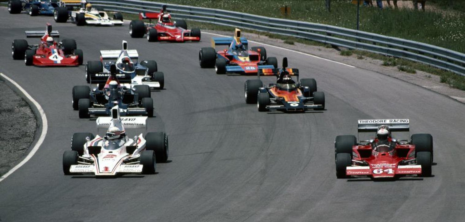 Here is one last photo of the car as it comes around on the warm up lap at Mosport alongside,Brian Redman, Danny Ongais, Jackie Oliver, US F5000, Mosport, 1976.