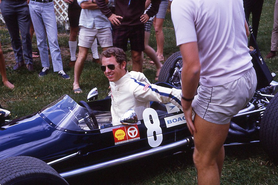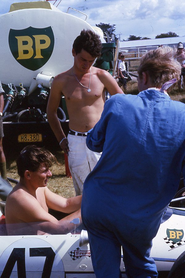 Bruce McLaren. Ray Stone in the overalls.
