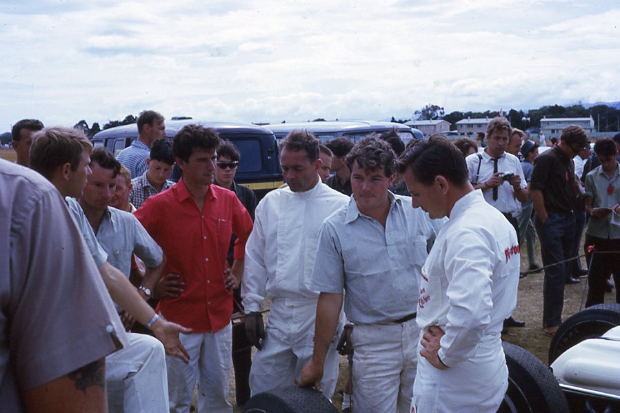 Bill Caldwell, Graeme Lawrence and Ray Thackwell with Roly Levis sitting on the tyre of Caldwell's Brabham.