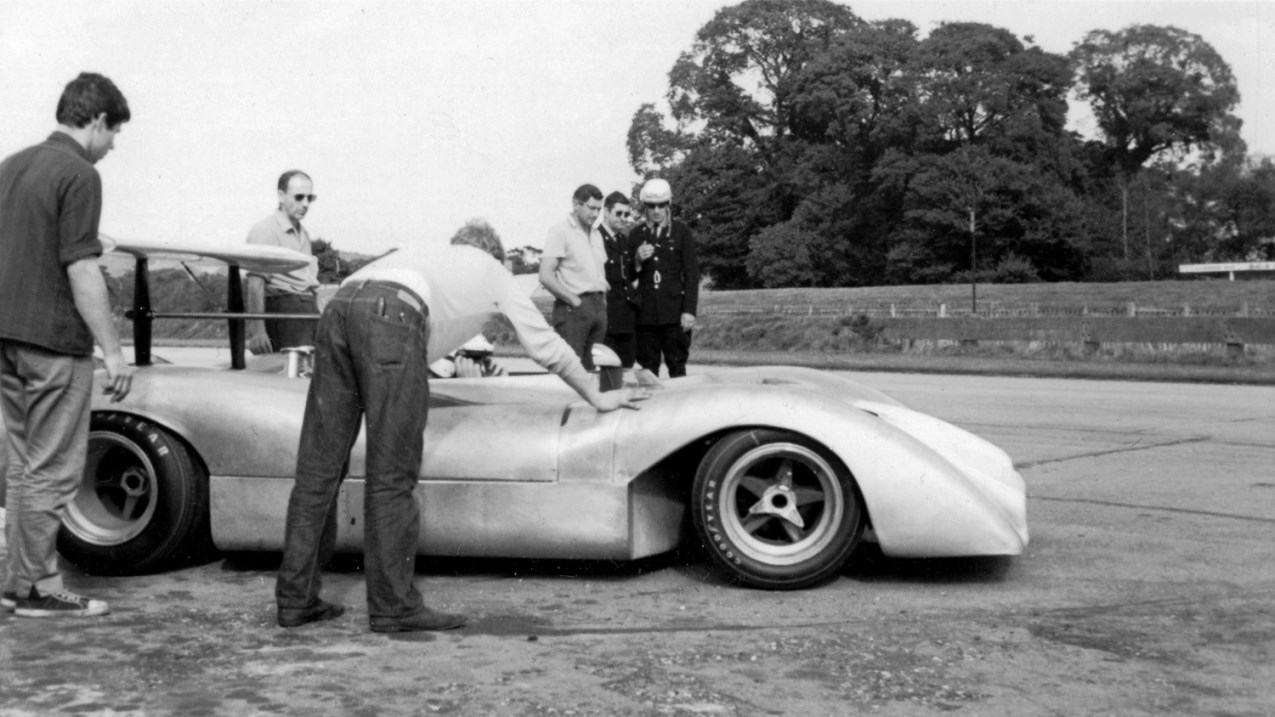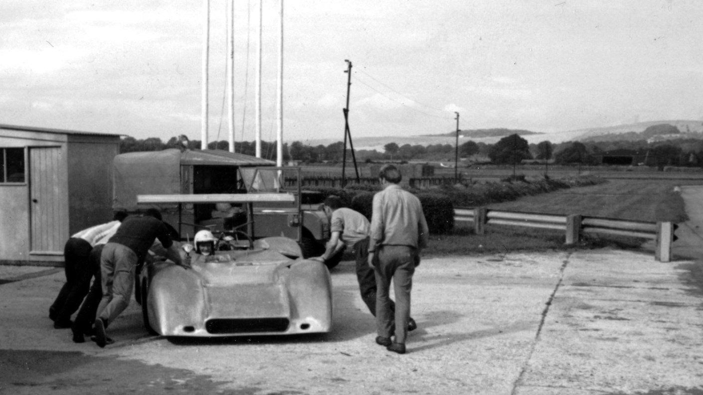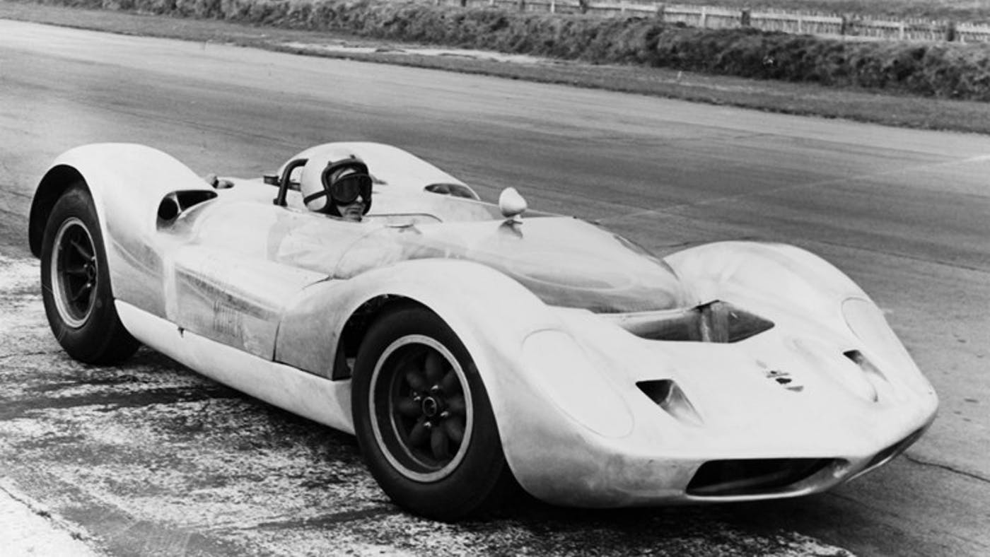 "Bruce McLaren liked to test a new car without the bodywork in order to get a sense of how it performed without any aerodynamic effects. One result seen here is the M6A’s front tire lifting off the surface at Goodwood."