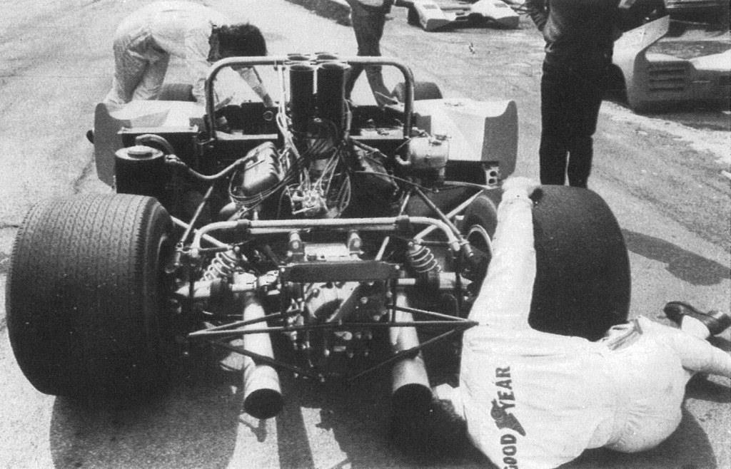 I think that is Bruce under the rear of the car and Cary Taylor at the front. Goodwood pit area. May 1970