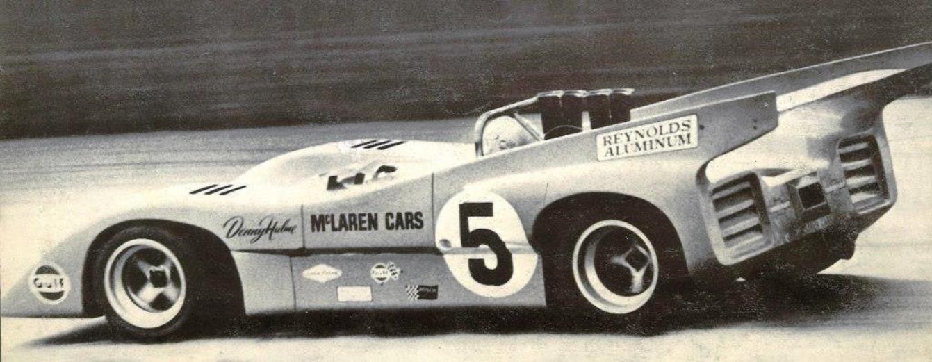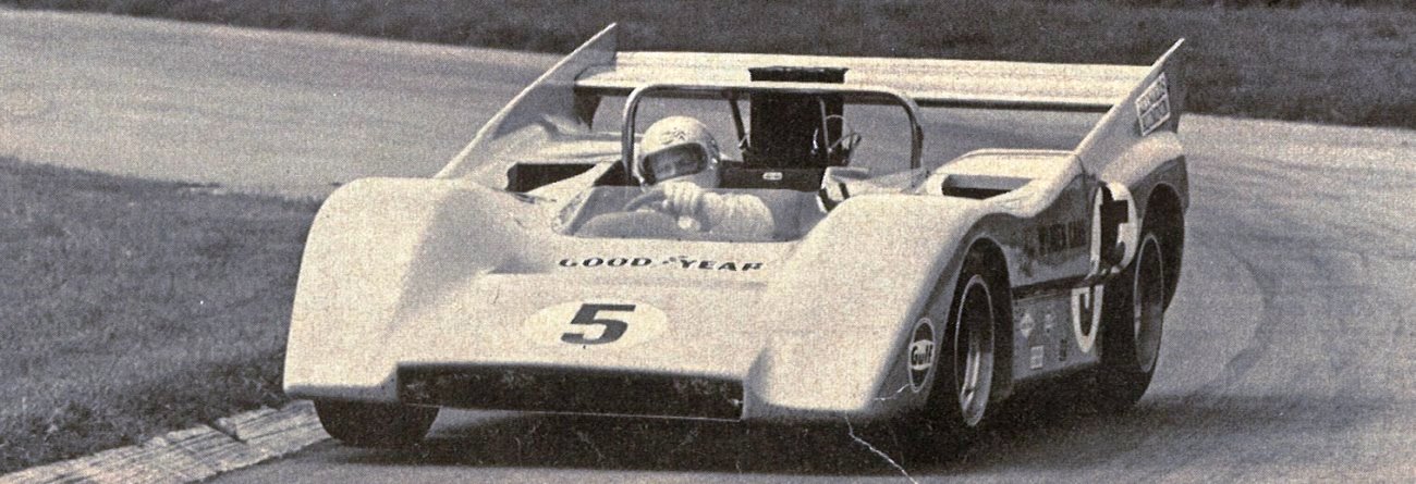 Bruce McLaren cornering in the M8D at Goodwood. May 1970. (Note the rear wing !)