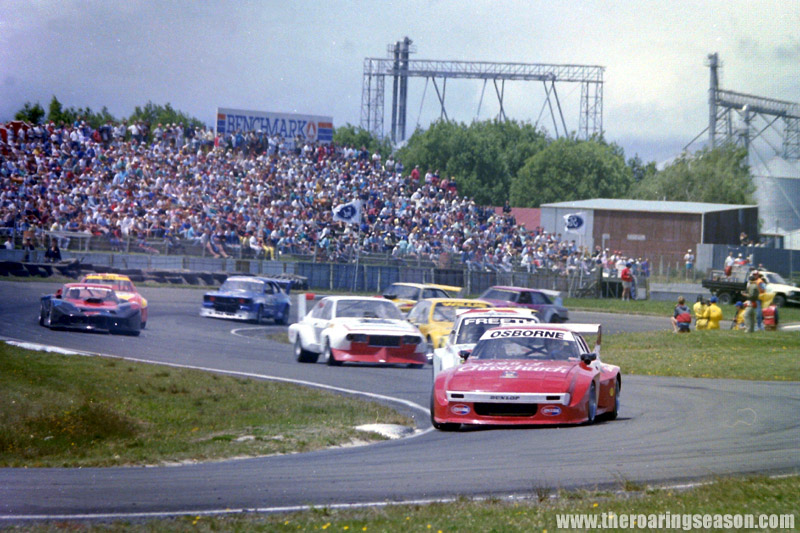 the commodore is the ex group c car, (Lance Johnson ?) The mazda could also be Bob Culinaine, behind the commodore, Volvo, then (in red) is Rex findlay in the ex anderson Mustang, Jennifer Mossman in the consul, Chris Toms in Escort. I think this shot was taken immediately after the previous picture