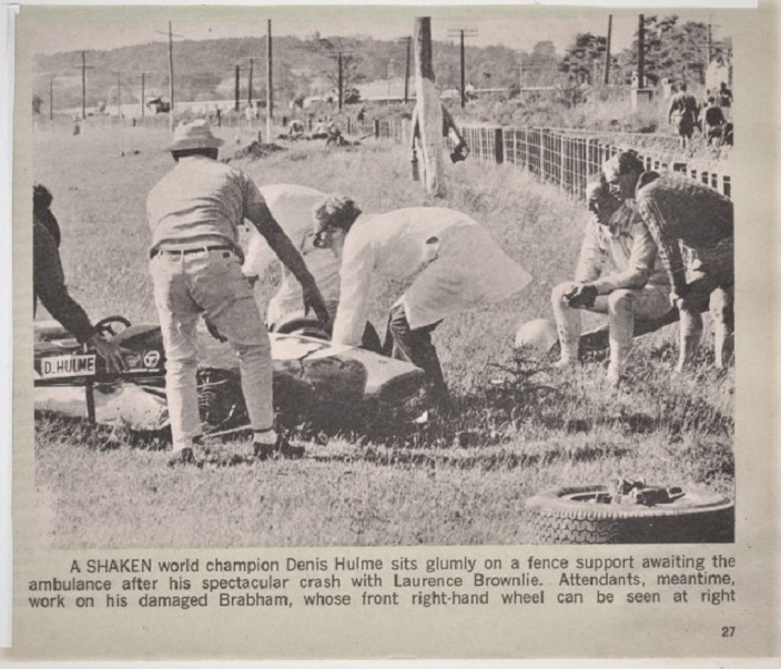 Amazing photo. Brings back memories. I had been at the railway corner and remember Hulme shaking his fist at Brownlie then bumping his car hard with the front wheel bouncing going into railway corner then further down the back straight we could see the wheels, body panels, dirt way into the air. Denny walked very slowly to the ambulance and was very pale and Brownlie,s leg very damaged. I thought Brownlie was on the ground at the back of the ambulance? How they didn't die! Good photo and at the time someone was upset at photos being taken but good to see this. Thanks.