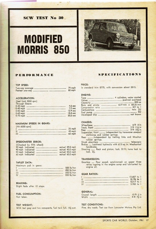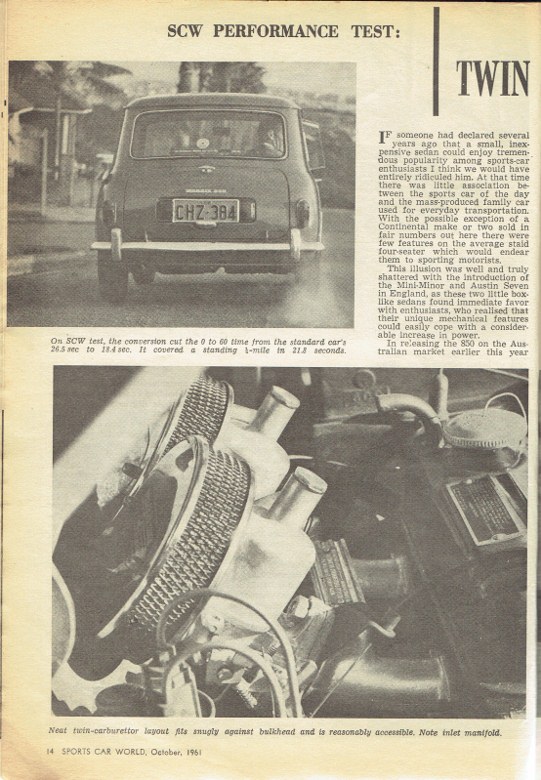 Sports Car World - the Australian Motoring Magazine - a Road Test of a slightly modified Mini 850 in the October 1961 Issue