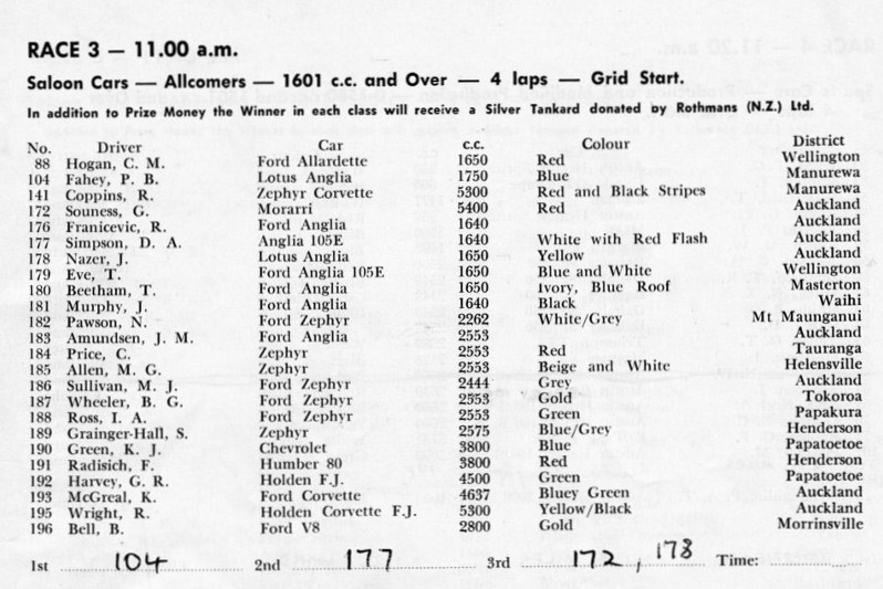 Dave Simpson, Lotus Anglia #177 and Garth Souness, Morrari #172 through the Esses at Pukekohe is this the same meeting ? Yes it is as noted below;