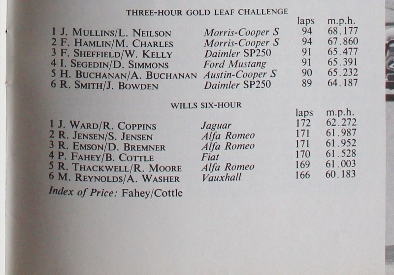 You with W " Bill " Kelly finished 3rd behind the Morris Cooper S's of Mullins / Neilson 1st and Hamlin / Charles 2nd, with then the Mustang, Segedin / Simmons 4th the Buchanan Austin Cooper S 5th and then Roger Smith and J Bowden in another Daimler SP 250 6th.