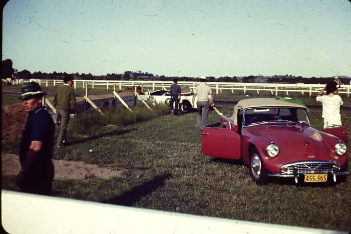 A Daimler SP 250 close to a competitors car that had come to grief in the Horse barriers.