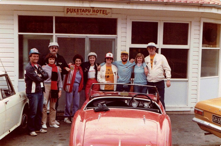 At the Puketapu Hotel, with BMC BOY on the left and John Wilson on the right, next to John the other 2 of the " Four Kiwi's " and next to them Shirley Wilson,