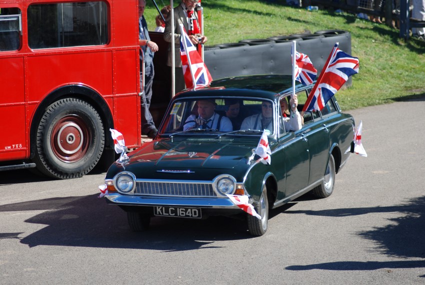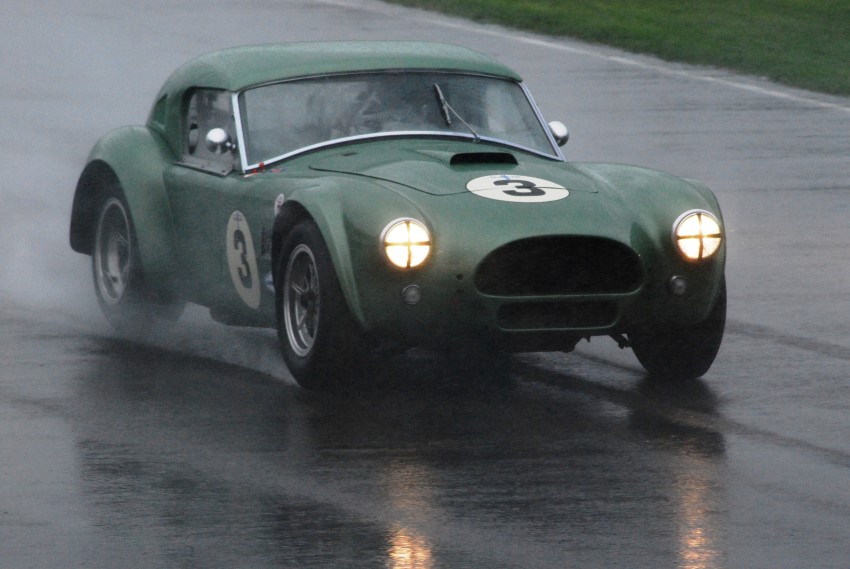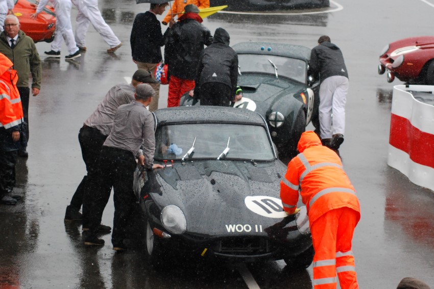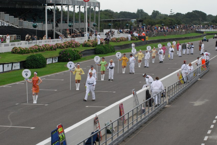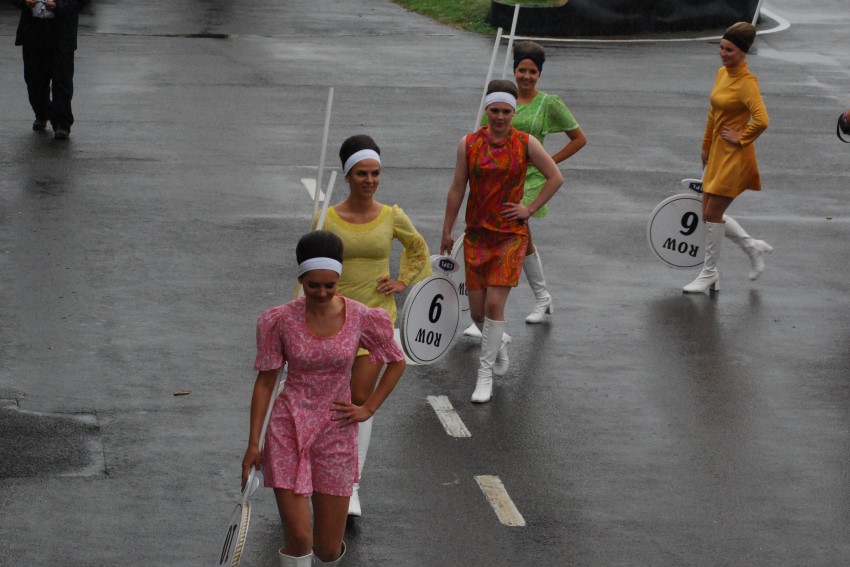 The 60's attired grid girls with the hand permanently on the left hip. Always a brave smile even though the weather on Saturday, wasn't too good. This was taken a matter of seconds before the rain started - the cars have just set off on their formation lap.