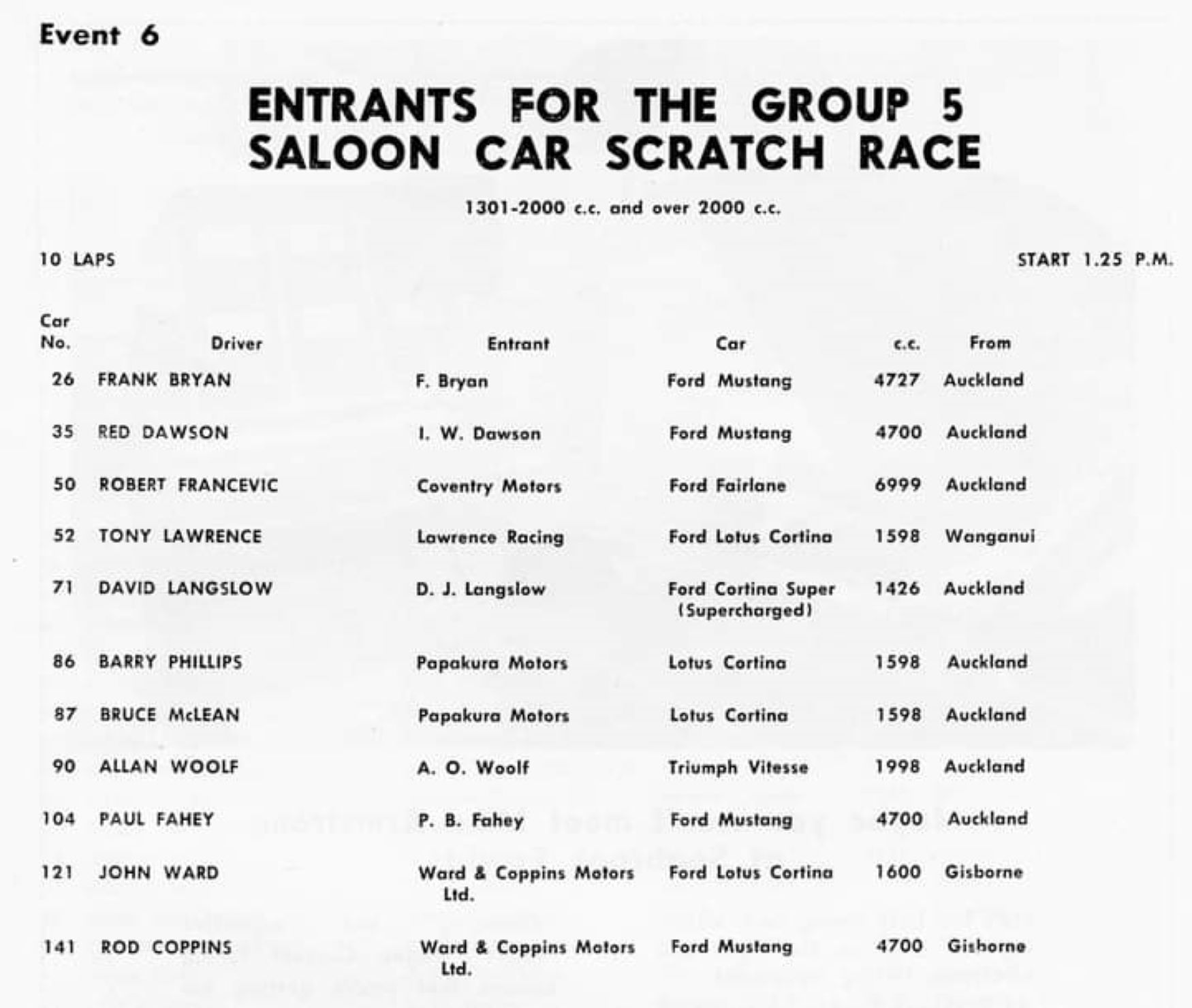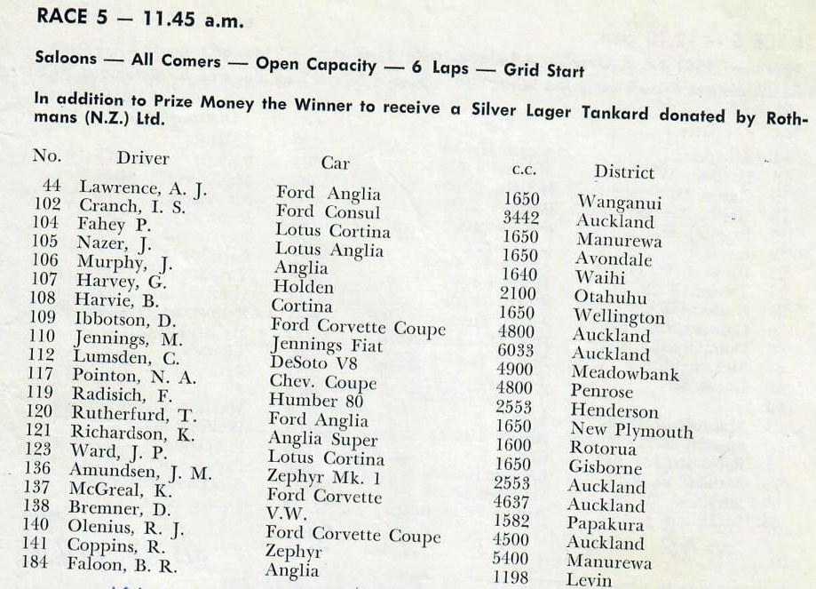 " Pukekohe post no 514 the first entry list for Race 5 is from the Auckland Car Club meeting on December 12, 1964.