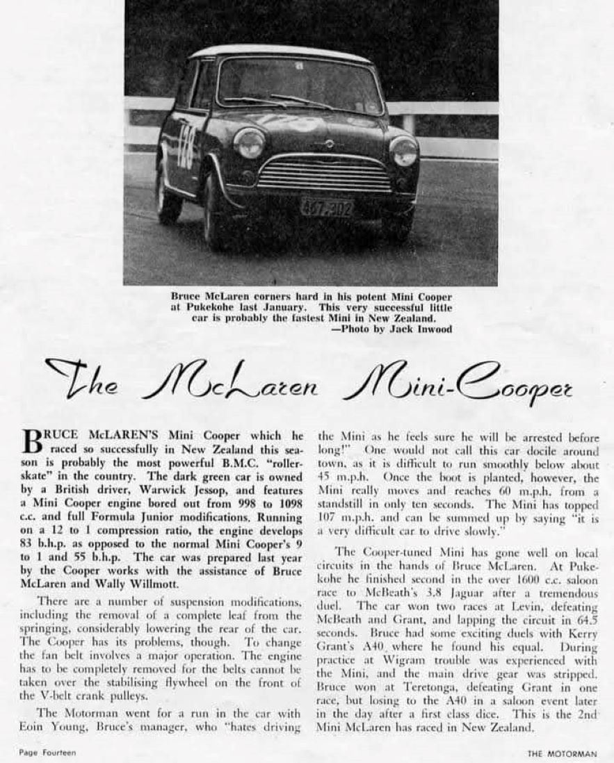 More has come to light on the Bruce McLaren Cooper - as Bruce himself was at Cooper Works at the time, racing in Grand Prix and helped prepare the Mini which was modified - a 998 cc Motor taken out to 1098 cc and a few other mods besides.