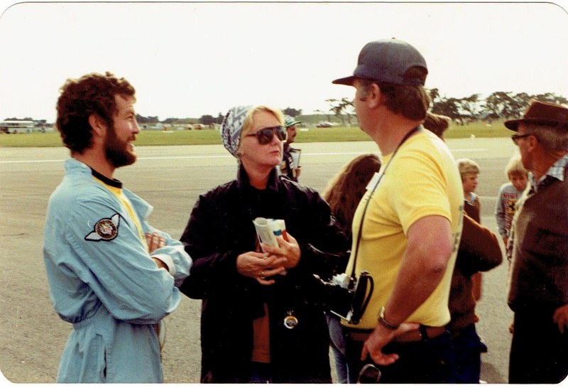 Frank talking to Nell and Mark Donaldson - Mark raced at Ardmore 1989 and in the Le Mans Relay Race in 1982 in his BN2 Austin-Healey 100/4