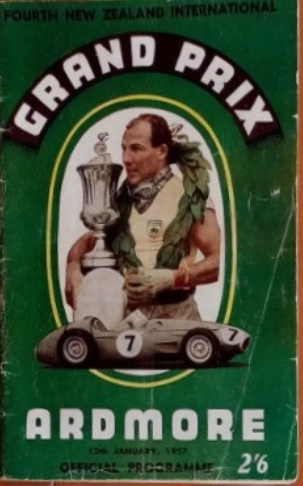 Stirling Moss with the Trophy the NZ Motor Cup and an image of the car - from the cover of the 1957 Programme.