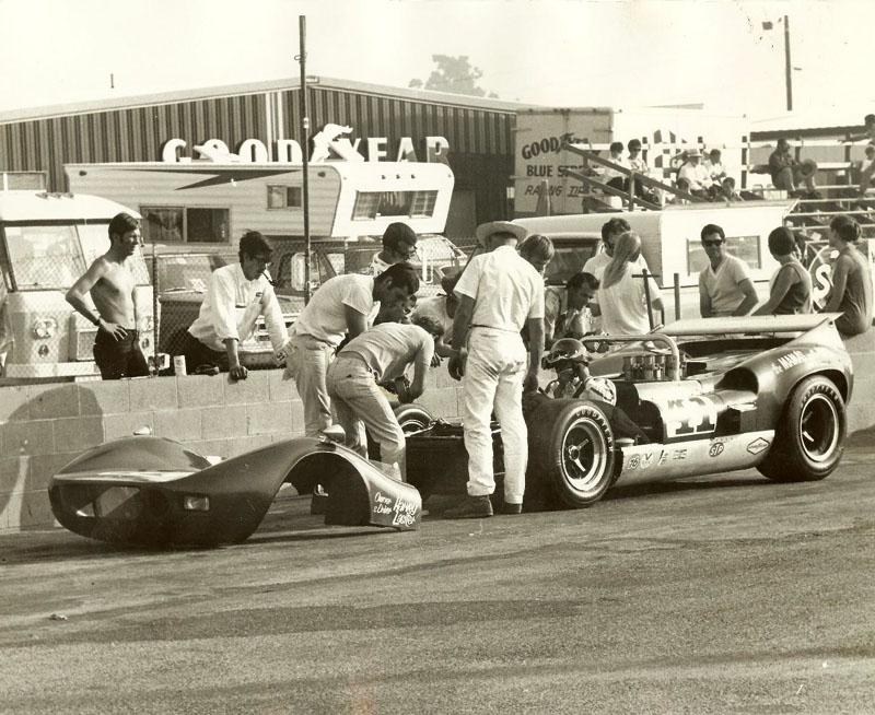 This is a really great shot, taken in the pits during the 1968 Riverside Can-Am race. Thanks to Chad's keen investigative work, we know thats Doane Spencer leaning over the radiator, helping the team out with 'his' old car.