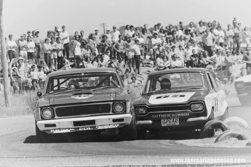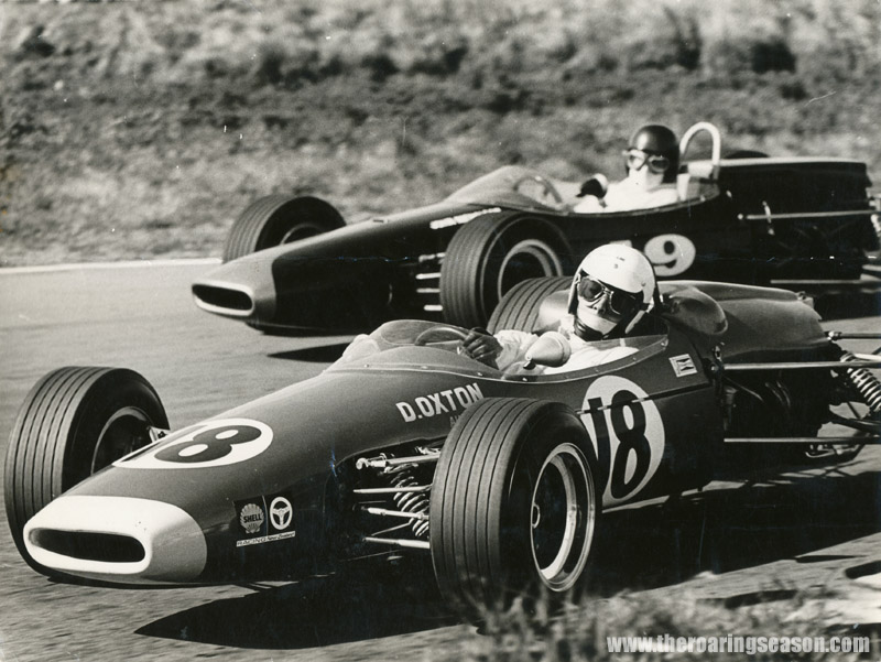 David Oxton’s Brabham cuts inside John Nicholson’s Brabham BT18 as they round the hairpin in the first round of the 1.5 litre Gold Star Championship for 1968/69. The race was won by Bert Hawthorne’s Brabham BT21C Twin Cam. Despite missing the first two rounds, Graham McRae won 6 of the remaining 7 rounds in his home-built McRae Twin Cam, to be overall winner of the series. After the last round McRae went overseas in the newly revived “Driver to Europe” scheme.