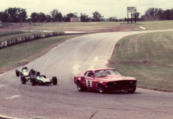 An interesting practice picture of the Jeff Barnes Mustang at Oran Park with a couple of Formula Fords in pursuit. This image of mine has been on the net at another site, but in the context of a run of FF photos I though I would include it. The performance difference overall betweeen the Mustang and the open wheelers around Oran Park appeared minimal although I expect the technique was very different :)