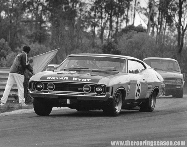 John French, in the Bryan Byrt XA Falcon GT hardtop, one of the half-dozen or so RPO83 cars that ran in Group C in 1973. This car was quite distinctive, for its lime green and purple colour scheme. It was later converted into a Sports Sedan, and was the first car Dick Johnson drove for Bryan Byrt.