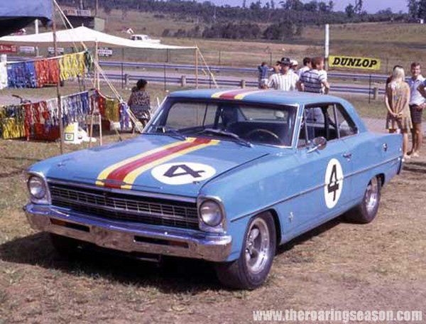 Norm Beecheys awesome Chevy Nova, in its 1968 guise. The Nova was part of the Tridents/Neptune Racing Team, who usually changed their colour scheme each year. This car first appeared in 1966 (at the Australian Touring Car Championship held at Bathurst no less) painted navy blue with this white stripes. For 1967 it was black with red and yellow stripes, before this colour was applied for 1968. The car is now restored to its 1967 guise, which is probably its most memorable.