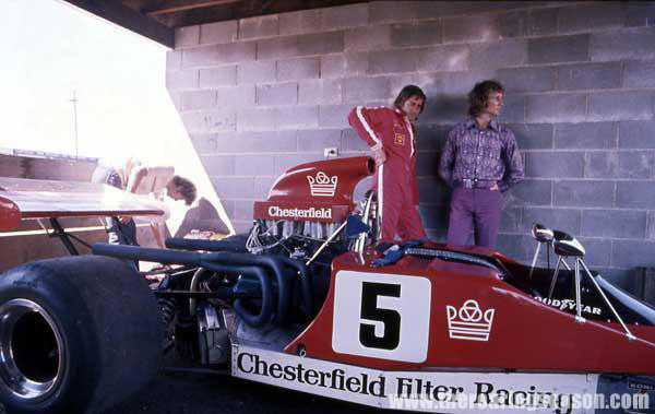 Kevin Bartlett, and his awesome Lola T300 at Surfers Paradise in 1972. Standing next to big-rev-Kev appears to be John Harvey. Check out the purple outfit! Damn, the '70s were wild!