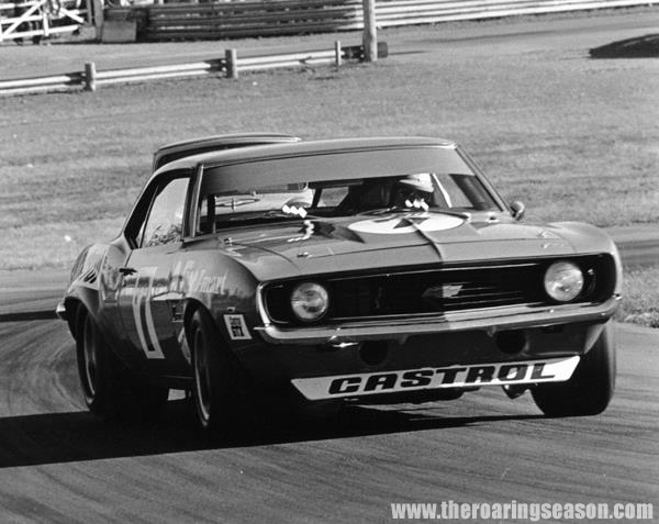 Bob Jane's awesome 7 litre ZL/1 Camaro, powering towards an eventual third place finish at Lakeside, 1971. Jane sat in second position for much of the race, chasing leader Allan Moffat in his Mustang, before wheel bearing failure slowed the Camaro late on, allowing Pete Geoghegan up to second in his Mustang.