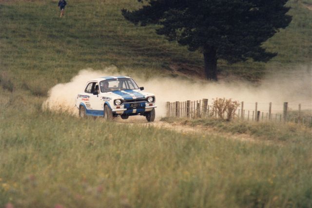 Rowan Morgan in the Commodore Computers Escort picks up a rear wheel in the ruts at Anderson's Farm - 85/86.