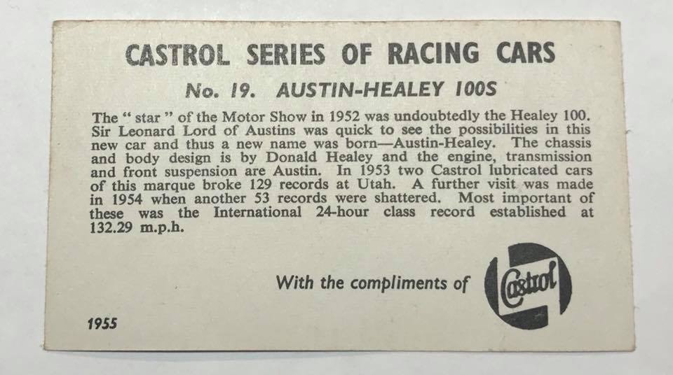 A card on the Austin Healey 100S was posted on a Fb page " Austin Healey 100S " some time ago by Paul O'Neill - Paul has the whole set of 24 cards which he recently got out and photographed;