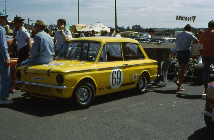 Hoping that someone is going to post a colour of the yellow peril Harrington #69 Imp. The car often led, even against the might of Barry Phillips Mini #86 but rarely saw a chequered flag. I can almost hear the groan of the crowd at Baypark as the Imp pulled off the track with steam emanating from it's rear.